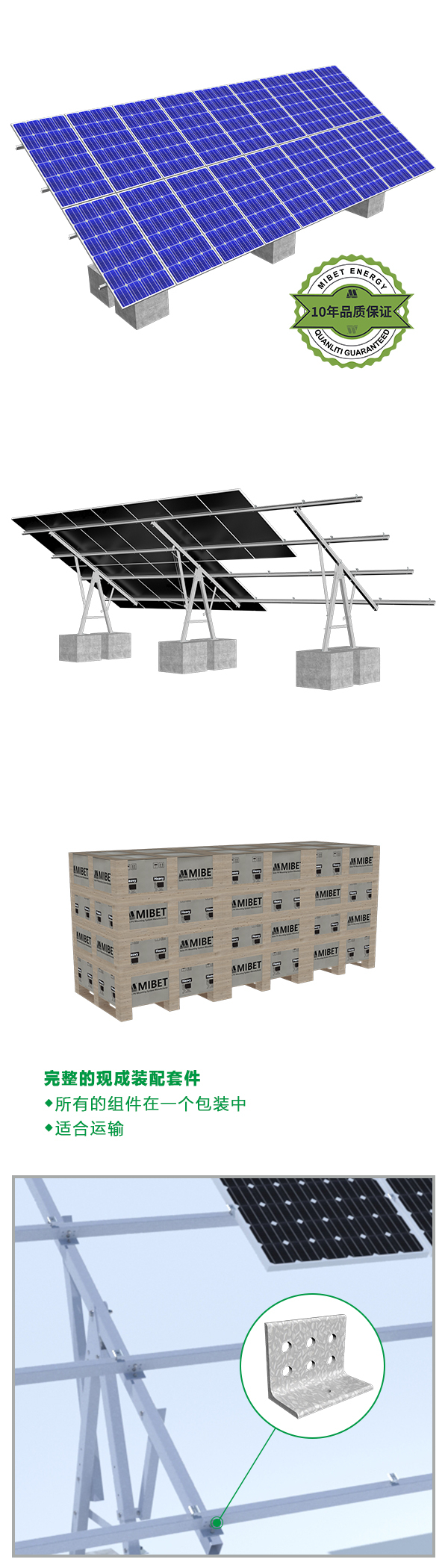 MRac手動可調節(jié)地面支架 適用于大型商業(yè)及公共事業(yè)電站的安裝,該產(chǎn)品結構牢固、穩(wěn)固性強,主要配件采用碳鋼制成,具有良好的抗腐蝕能力。該產(chǎn)品設計靈活,可手動調節(jié)電池板角度,讓發(fā)電效率更高,收益更大。結構上的優(yōu)化設計,有效的提高了安裝時效,大大降低 了工程安裝成本。
